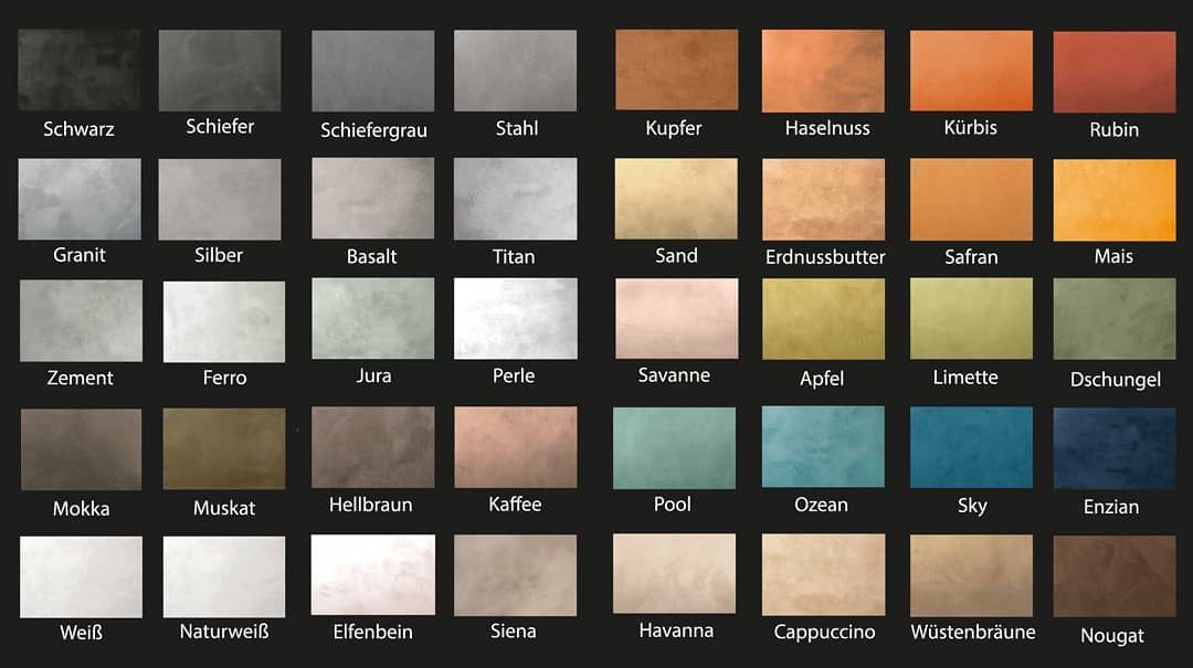 Und ein Leben ohne Farbe wäre wohl im wahrsten Sinne des Wortes grau. Um der Individualität des Einzelnen gerecht zu werden gibt es ProCement in 40 Standardtönen. Zusätzlich besteht die gestalterische Möglichkeit der Kombination mit zahlreichen Metallictönen, welche eine nahezu unendliche Gestaltungsvielfalt ermöglichen.
